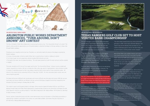 The City of Arlington ’ s Public Works Department is announcing the return of our “ Turn Around Don ’ t Drown ” art contest . This annual contest provides an opportunity for our 3rd grade students to illustrate the dangers of driving , walking , or riding a bike through flooded roadways .