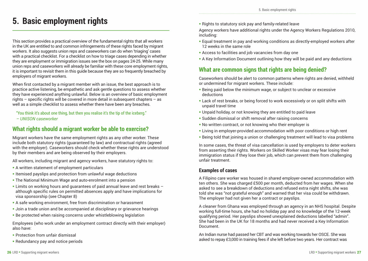 Caseworkers should be alert to common patterns where rights are denied, withheld or undermined for migrant workers. These include: