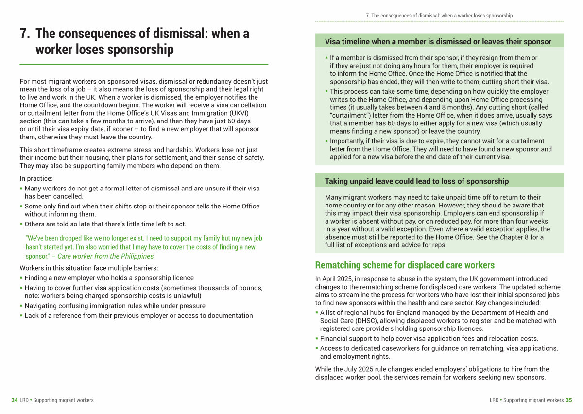 For most migrant workers on sponsored visas, dismissal or redundancy doesn’ t just mean the loss of a job – it also means the loss of sponsorship and their legal right to live and work in the UK. When a worker is dismissed, the employer notifies the Home Office, and the countdown begins. The worker will receive a visa cancellation or curtailment letter from the Home Office’ s UK Visas and Immigration( UKVI) section( this can take a few months to arrive), and then they have just 60 days – or until their visa expiry date, if sooner – to find a new employer that will sponsor them, otherwise they must leave the country.