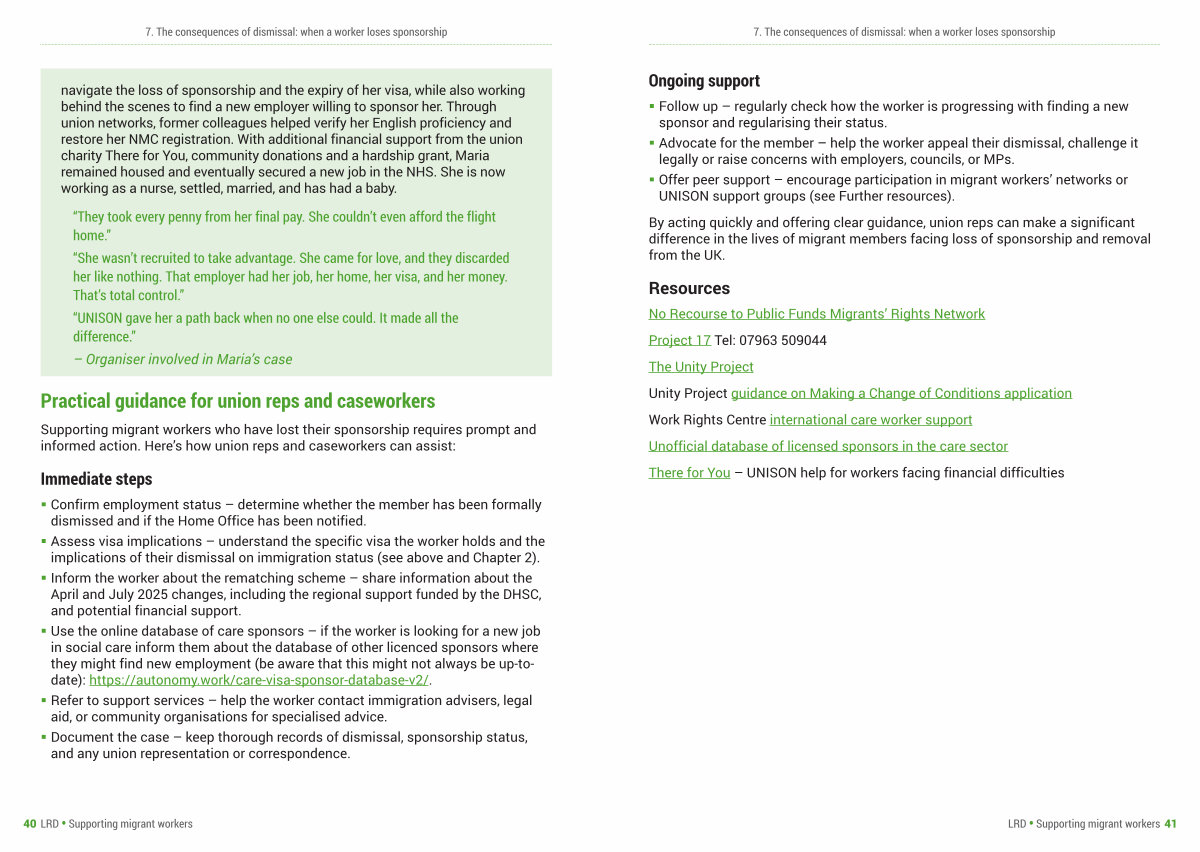 navigate the loss of sponsorship and the expiry of her visa, while also working behind the scenes to find a new employer willing to sponsor her. Through union networks, former colleagues helped verify her English proficiency and restore her NMC registration. With additional financial support from the union charity There for You, community donations and a hardship grant, Maria remained housed and eventually secured a new job in the NHS. She is now working as a nurse, settled, married, and has had a baby.