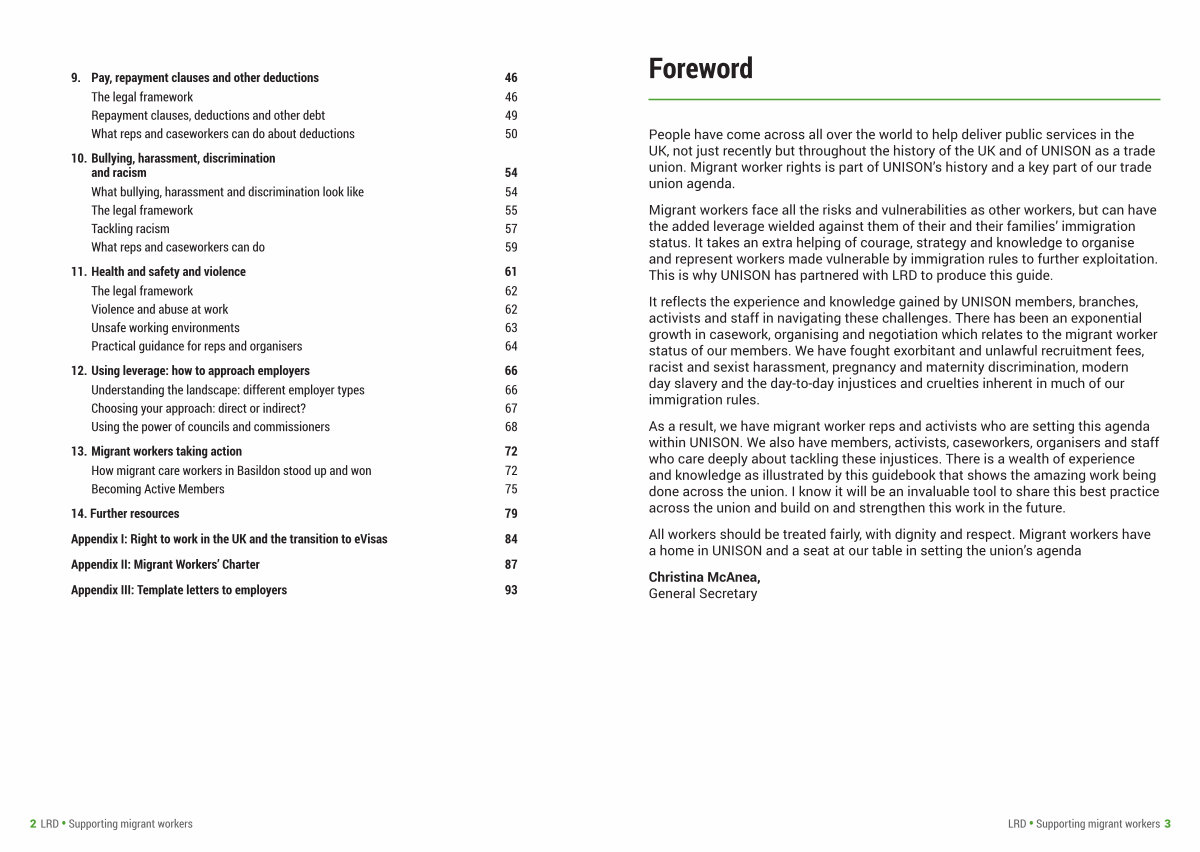 Migrant workers face all the risks and vulnerabilities as other workers, but can have the added leverage wielded against them of their and their families’ immigration status. It takes an extra helping of courage, strategy and knowledge to organise and represent workers made vulnerable by immigration rules to further exploitation. This is why UNISON has partnered with LRD to produce this guide.