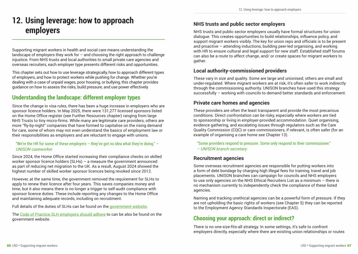 Since the change in visa rules, there has been a huge increase in employers who are sponsor licence holders. In May 2025, there were 131,277 licensed sponsors listed on the Home Office register( see Further Resources chapter) ranging from large NHS Trusts to tiny micro-firms. While many are legitimate care providers, others are more“ fly-by-night” companies that have formed to capitalise on the rising demand for care, some of whom may not even understand the basics of employment law or their responsibilities as employers and are reluctant to engage with unions.