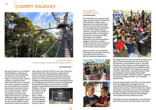 On days five and six, we visited the Canopy Walkway, standing over 118 feet in the air and stretching for a third of a mile. From that height, we witnessed God’s perfect creation in a way I had never experienced. On day 5, we watched the sunset; on day 6, we watched the sunrise. Both were among the most peaceful moments I’ve ever had. In those moments, nothing else seemed to matter—I felt completely at peace and truly happy. As the sun rose, I saw trees peeking through the clouds and two macaws flying together across the sky. I was so caught up in the moment that I didn’t even think to take a picture, and I don’t think I’ll ever see a view more beautiful than that. This experience really made me reflect on the Sacred Heart’s Essential Dimensions - Mystical, Ecological, and Ethical. Mystically, I felt God’s presence in the way He painted the sky so beautifully, making the moment feel special for me and those around me. Ecologically, the nature around us was breathtaking -
