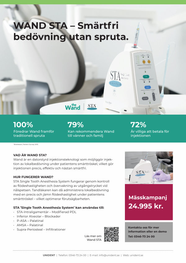 VAD ÄR WAND STA? Wand är en datorstyrd injektionsteknologi som möjliggör injektion av lokalbedövning under patientens smärttröskel, vilket gör injektionen precis, effektiv och nästan smärtfri.