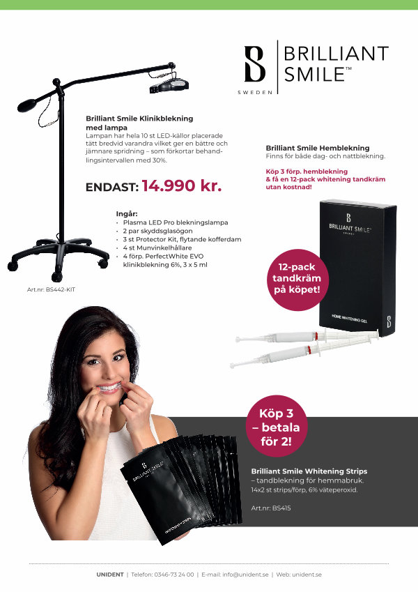 Brilliant Smile Klinikblekning med lampa Lampan har hela 10 st LED-källor placerade tätt bredvid varandra vilket ger en bättre och jämnare spridning – som förkortar behandlingsintervallen med 30 %.