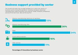 The Growth Hub team has provided assistance to a real cross-section of business sectors during the pandemic , including : aerospace , advanced manufacturing , creative industries , life sciences , media , transport , professional services firms and more . Here are the top five :