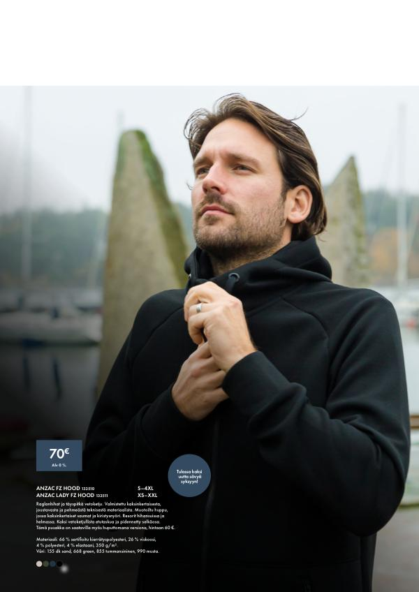 Raglanhihat ja täyspitkä vetoketju. Valmistettu kaksinkertaisesta, joustavasta ja pehmeästä teknisestä materiaalista. Muotoiltu huppu, jossa kaksinkertaiset saumat ja kiristysnyöri. Resorit hihansuissa ja helmassa. Kaksi vetoketjullista etutaskua ja pidennetty selkäosa. Tämä pusakka on saatavilla myös huputtomana versiona, hintaan 60 €.