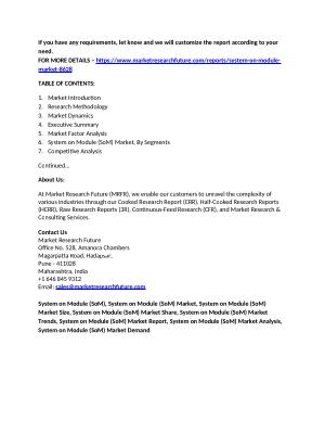 1 . Market Introduction 2 . Research Methodology 3 . Market Dynamics 4 . Executive Summary 5 . Market Factor Analysis 6 . System on Module ( SoM ) Market , By Segments 7 . Competitive Analysis