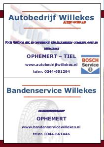 ____________ Autobedrijf Willekes ALTIJD GOED AF! ‾‾‾‾‾‾‾‾‾‾‾ VOOR VERKOOP, APK, EN ONDERHOUD VAN ALLE MERKEN COMPLEET, GOED EN BETAALBAAR OPHEMERT – TIEL www.autobedrijfwillekes.nl telnr. 0344-651294 ____________ Bandenservice Willekes ‾‾‾‾‾‾‾‾‾‾‾ DE BANDENSPECIALIST OPHEMERT www.bandenservicewillekes.nl telnr. 0344-661446