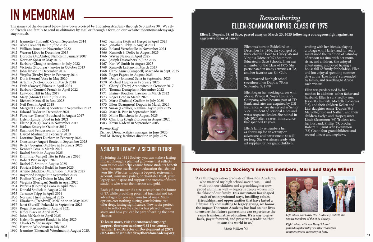 “ As a third-generation graduate of Thornton Academy, who married my high school sweetheart,— and with both our children and a granddaughter now proud alumni as well— legacy is deeply woven into the fabric of our family. This institution has shaped each of us in profound ways, instilling values, friendships, and opportunities that have lasted a lifetime. By committing to legacy giving, we honor the impact Thornton Academy has had on our lives to ensure that future generations can experience the same transformative education. It’ s a way to give back, pay it forward, and preserve a tradition that means the world to us.”