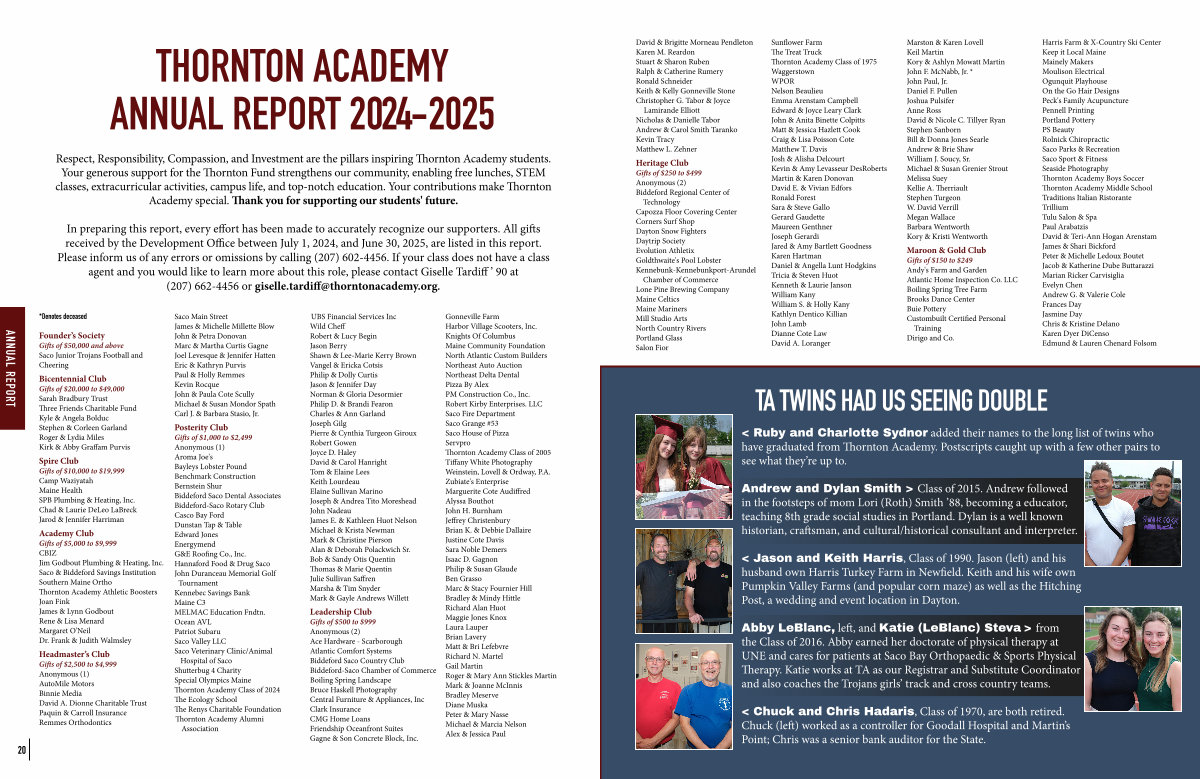 Harris Farm & X-Country Ski Center Keep it Local Maine Mainely Makers Moulison Electrical Ogunquit Playhouse On the Go Hair Designs Peck ' s Family Acupuncture Pennell Printing Portland Pottery PS Beauty Rolnick Chiropractic Saco Parks & Recreation Saco Sport & Fitness Seaside Photography Thornton Academy Boys Soccer Thornton Academy Middle School Traditions Italian Ristorante Trillium Tulu Salon & Spa Paul Arabatzis David & Teri-Ann Hogan Arenstam James & Shari Bickford Peter & Michelle Ledoux Boutet Jacob & Katherine Dube Buttarazzi Marian Ricker Carvisiglia Evelyn Chen Andrew G. & Valerie Cole Frances Day Jasmine Day Chris & Kristine Delano Karen Dyer DiCenso Edmund & Lauren Chenard Folsom |