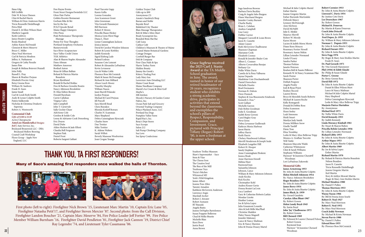 Ilana Gilg Bill Griffith Dale W. & Joyce Hansen Clint & Rachel Harris William & Dixie Anderson Harris Tricia Rousselle Heidelbaugh Petra Hild Daniel E. & Ellen Wilson Huot Matthew Lagarde Keith Lefebvre Janice Boutet Loughlin Roula Maalouf Ashley Katon McDonald Clement & Merri Meserve Bruce C. Miller Mary Neal Morrison Carl & Patricia Moulton Jeffrey A. Nathanson Gregory & Cathy Paradis James Pate Joseph & Melissa Boisvert Pennell John Polly Russell L. Pray Shawn & Heather Prejean Elizabeth Procter-Gray Betsy Greene Ross William M. Sanborn Frank H. Sears Jamie Small Carl & Lorali Roth Smith Andy & Lynne Colpitts Smith Paiten Sulikowski Nicholas & Christina Doukeris