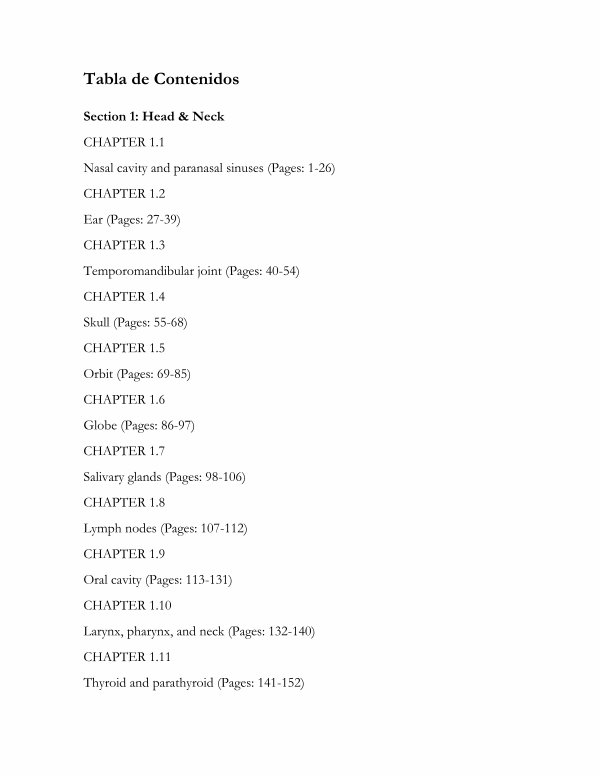 Section 1: Head & Neck CHAPTER 1.1 Nasal cavity and paranasal sinuses( Pages: 1-26) CHAPTER 1.2 Ear( Pages: 27-39) CHAPTER 1.3 Temporomandibular joint( Pages: 40-54) CHAPTER 1.4 Skull( Pages: 55-68) CHAPTER 1.5 Orbit( Pages: 69-85) CHAPTER 1.6 Globe( Pages: 86-97) CHAPTER 1.7 Salivary glands( Pages: 98-106) CHAPTER 1.8 Lymph nodes( Pages: 107-112) CHAPTER 1.9 Oral cavity( Pages: 113-131) CHAPTER 1.10 Larynx, pharynx, and neck( Pages: 132-140) CHAPTER 1.11 Thyroid and parathyroid( Pages: 141-152)