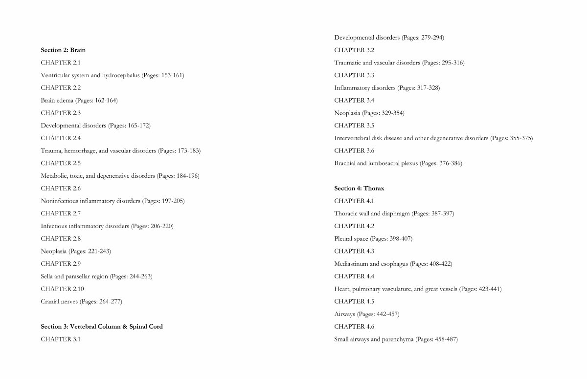 Section 2: Brain CHAPTER 2.1 Ventricular system and hydrocephalus( Pages: 153-161) CHAPTER 2.2 Brain edema( Pages: 162-164) CHAPTER 2.3 Developmental disorders( Pages: 165-172) CHAPTER 2.4 Trauma, hemorrhage, and vascular disorders( Pages: 173-183) CHAPTER 2.5 Metabolic, toxic, and degenerative disorders( Pages: 184-196) CHAPTER 2.6 Noninfectious inflammatory disorders( Pages: 197-205) CHAPTER 2.7 Infectious inflammatory disorders( Pages: 206-220) CHAPTER 2.8 Neoplasia( Pages: 221-243) CHAPTER 2.9 Sella and parasellar region( Pages: 244-263) CHAPTER 2.10 Cranial nerves( Pages: 264-277)