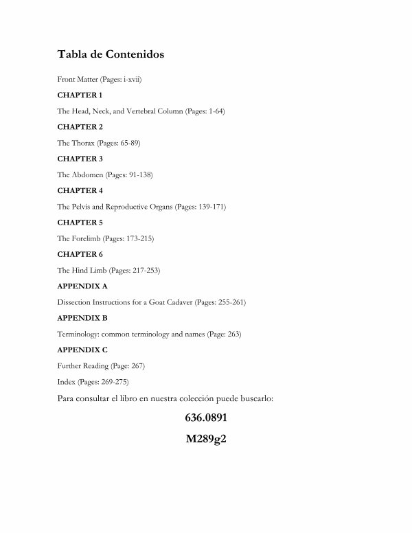 Front Matter( Pages: i-xvii) CHAPTER 1 The Head, Neck, and Vertebral Column( Pages: 1-64) CHAPTER 2 The Thorax( Pages: 65-89) CHAPTER 3 The Abdomen( Pages: 91-138) CHAPTER 4 The Pelvis and Reproductive Organs( Pages: 139-171) CHAPTER 5 The Forelimb( Pages: 173-215) CHAPTER 6 The Hind Limb( Pages: 217-253) APPENDIX A Dissection Instructions for a Goat Cadaver( Pages: 255-261) APPENDIX B Terminology: common terminology and names( Page: 263) APPENDIX C Further Reading( Page: 267) Index( Pages: 269-275)