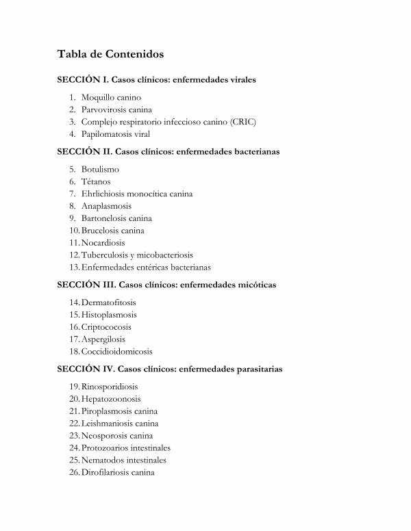 5. Botulismo 6. Tétanos 7. Ehrlichiosis monocítica canina 8. Anaplasmosis 9. Bartonelosis canina 10. Brucelosis canina 11. Nocardiosis 12. Tuberculosis y micobacteriosis 13. Enfermedades entéricas bacterianas
