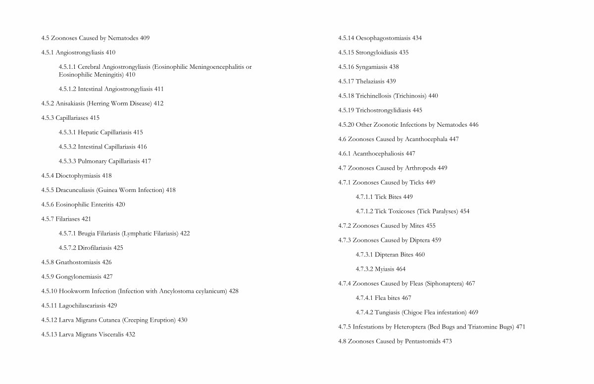 4.5.1.2 Intestinal Angiostrongyliasis 411 4.5.2 Anisakiasis( Herring Worm Disease) 412 4.5.3 Capillariases 415 4.5.3.1 Hepatic Capillariasis 415 4.5.3.2 Intestinal Capillariasis 416 4.5.3.3 Pulmonary Capillariasis 417 4.5.4 Dioctophymiasis 418 4.5.5 Dracunculiasis( Guinea Worm Infection) 418 4.5.6 Eosinophilic Enteritis 420 4.5.7 Filariases 421 4.5.7.1 Brugia Filariasis( Lymphatic Filariasis) 422 4.5.7.2 Dirofilariasis 425 4.5.8 Gnathostomiasis 426 4.5.9 Gongylonemiasis 427 4.5.10 Hookworm Infection( Infection with Ancylostoma ceylanicum) 428 4.5.11 Lagochilascariasis 429 4.5.12 Larva Migrans Cutanea( Creeping Eruption) 430 4.5.13 Larva Migrans Visceralis 432