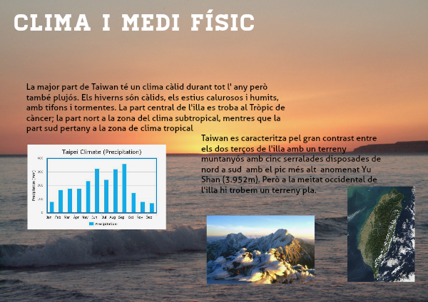 Taiwan es caracteritza pel gran contrast entre els dos terços de l'illa amb un terreny muntanyós amb cinc serralades disposades de nord a sud amb el pic més alt anomenat Yu Shan (3.952m). Però a la meitat occidental de l'illa hi trobem un terreny pla.