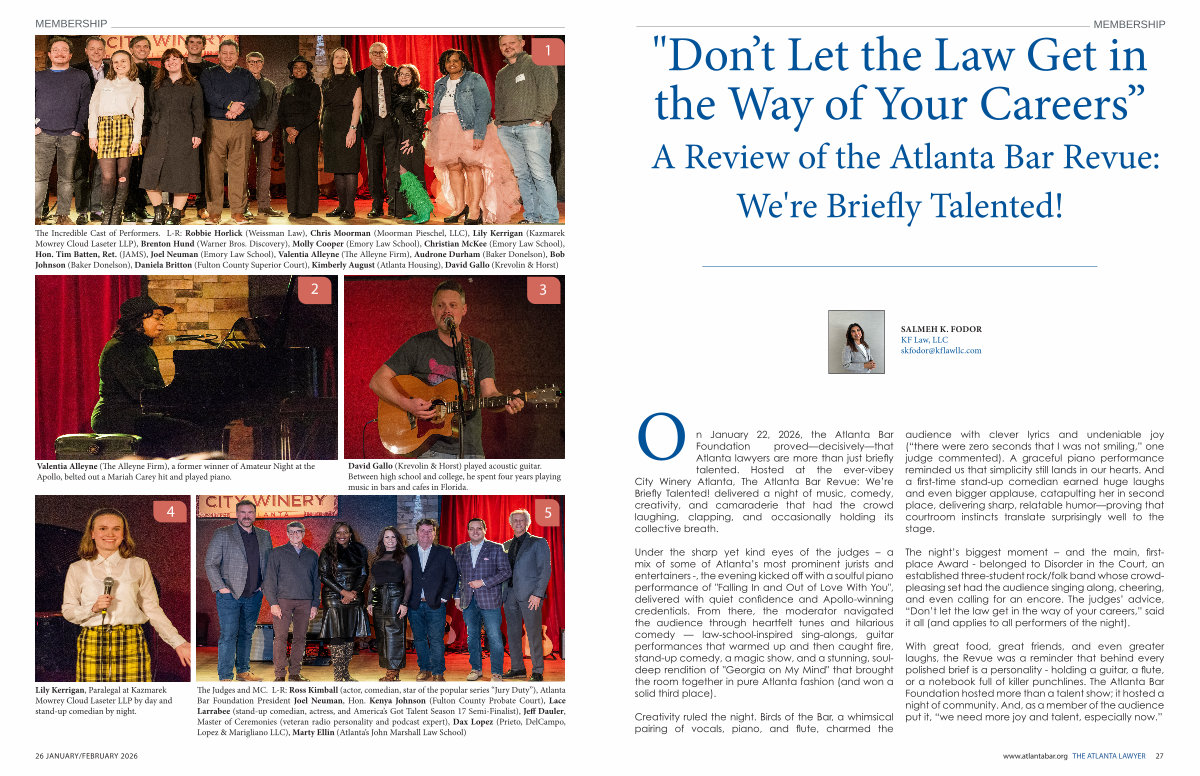O n January 22, 2026, the Atlanta Bar Foundation proved— decisively— that Atlanta lawyers are more than just briefly talented. Hosted at the ever-vibey City Winery Atlanta, The Atlanta Bar Revue: We’ re Briefly Talented! delivered a night of music, comedy, creativity, and camaraderie that had the crowd laughing, clapping, and occasionally holding its collective breath.