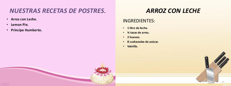 NUESTRAS RECETAS DE POSTRES. • Arroz con Leche. • Lemon Pie. • Príncipe Humberto. 62