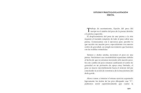 Talones y dedos unidos, movemos el peso en una pierna. Sentiremos una inestabilidad espontánea debido al hecho de que no estamos moviendo sólo nuestro peso. En este cambio de peso estamos cambiando el centro de gravedad en un perímetro de apoyo muy limitado, el peso se mueve inevitablemente hacia el exterior del pie cancelando la acción de resistencia de la musculatura del dedo gordo.