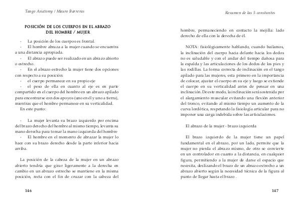- La posición de los cuerpos es frontal.- El hombre abraza a la mujer cuando se encuentra a una distancia apropiada.- El abrazo puede ser realizado en un abrazo abierto o estrecho.- En el abrazo estrecho la mujer tiene dos opciones con respecto a su posición:- el cuerpo permanece en su propio eje- el peso de ella en cuanto al eje es en parte compartido en el cuerpo del hombre en un abrazo apilado para encontrarse con dos apoyos( uno en él y uno a tierra), mientras que el hombre permanece en su verticalidad. En este punto: