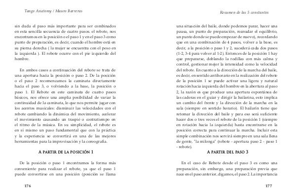 una situación del baile, donde podemos parar, hacer una pausa, un punto de preparación, reanudar el equilibrio, un punto donde se puede empezar de nuevo), recordando que en una combinación de 4 pasos, volver a la base, es decir, a la posición o paso 1 y 2, sucederá cada dos pasos( 1-2, 3-4 para volver al 1-2). Entonces de la posición 1 hay que prepararse, doblando la rodillas con más calma y control, gestionar mejor la intensidad como la velocidad del rebote. En cuanto a la dirección de la marcha del baile, es decir, en sentido antihorario en la realización del rebote de la posición 1 se puede activar una ligera y natural rotación hacia izquierda del hombre en la abertura al paso 2, la razón es que produce una apertura espontánea de las caderas en el guiar y dirigir la bailarina, esto implica un cambio del frente y la dirección de la marcha en la sala( siempre en sentido horario). El bailarín tiene que retomar la dirección del baile y para eso será suficiente hacer dos o tres veces el rebote de la posición 1( siempre en rotación hacia la izquierda) hasta encontrarse en la posición correcta para continuar la marcha. Incluir esta simple combinación nos servirá siempre en una sala llena de gente, " la milonga "( rebote- apertura paso 2- paso 1- rebote).