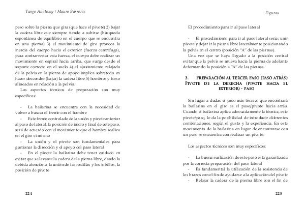 peso sobre la pierna que gira( que hace el pivote) 2) bajar la cadera libre que siempre tiende a subirse( búsqueda espontánea de equilibrio en el cuerpo que se encuentra en una pierna) 3) el movimiento de giro provoca la inercia del cuerpo hacia el exterior( fuerza centrífuga), para contrarrestar esta fuerza, el cuerpo debe realizar un movimiento en espiral hacia arriba, que surge desde el soporte correcto en el suelo 4) el ajustamiento relajado de la pelvis en la pierna de apoyo implica sobretodo en hacer descender( bajar) la cadera libre 5) hombros y torso alineados en relación a la pelvis.
