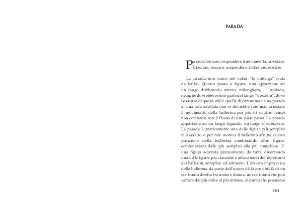 La parada non nasce nel salón“ la milonga”( sala da ballo). Questo passo o figura, non appartiene ad un tango d’ abbraccio stretto, milonghero, apilado, neanche dovrebbe essere parte del tango“ de salón”, dove l’ essenza di questi stili è quella di camminare: una parada in una sala affollata non si dovrebbe fare mai, arrestare il movimento della ballerina per più di quattro tempi non combacia con il flusso di una pista piena. La parada appartiene ad un tango figurato, un tango d’ esibizione. La parada è praticamente una delle figure più semplici in assoluto e per tale motivo il ballerino sfrutta questa posizione della ballerina combinando altre figure, combinazioni dalle più semplici alle più complesse. E’ una figura adottata praticamente da tutti, diventando una delle figure più classiche e affascinanti del repertorio dei ballerini, semplice ed attraente. L’ arresto improvviso della ballerina da parte dell’ uomo dà la possibilità di un confronto diretto tra uomo e donna, un confronto che può variare dal più dolce al più intenso, al punto che possiamo