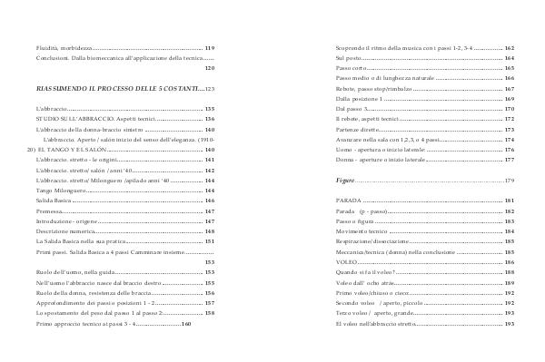 PARADA.................................................................................. 181 Parada( p- passo).................................................................... 182 Passo o figura........................................................................... 183 Movimento tecnico................................................................... 184 Respirazione / dissociazione....................................................... 185 Meccanica / tecnica( donna) nella conclusione............................ 185 VOLEO..................................................................................... 186 Quando si fa il voleo?............................................................... 188 Voleo dall’ ocho atrás................................................................ 189 Primo voleo / chiuso o cieco:....................................................... 192 Secondo voleo / aperto, piccolo............................................... 192 Terzo voleo / aperto, grande..................................................... 193 El voleo nell’ abbraccio stretto................................................... 193