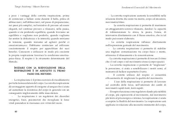 a poco i vantaggi della corretta respirazione, prima di cominciare a ballare come durante il ballo, prima di abbracciarci, nell’ abbracciarci, nel passo di preparazione, nei passi più semplici, nel tentativo di provare ad essere eleganti, nel continuo provare a rilassarci, nella pausa, quando si sta perdendo equilibrio, quando troviamo un equilibrio e vogliamo non perderlo, quando vogliamo far sentire la delicatezza o la intensità, quando entriamo in tensione, quando iniziamo ad agitarci perché ci emozioniamo, ecc. Dobbiamo cominciare ad utilizzare coscientemente il respiro per approfittare dei suoi benefici. Conoscere e utilizzare in modo più cosciente la propria respirazione favorisce la condizione emotivapsico-fisica. Il respiro è lo strumento determinante del Metodo.