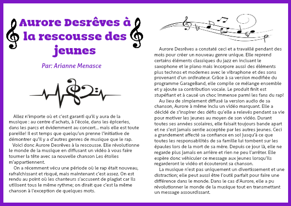 Allez n’importe où et c’est garanti qu’il y aura de la musique : au centre d’achats, à l’école, dans les épiceries, dans les parcs et évidemment au concert… mais elle est toute pareille! Il est temps que quelqu’un prenne l’initiative de démontrer qu’il y a d’autres genres de musique que le rap.