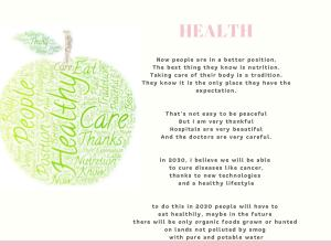 in 2030, I believe we will be able to cure diseases like cancer, thanks to new technologies and a healthy lifestyle