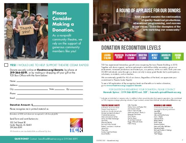 Donate securely online at theatrecr.org/donate, by phone at