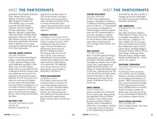 MICHAEL FOX THE GIRL WONDER / TINDER NEVER LIES Michael is excited for the opportunity to perform again at TCR. He performed in last year’ s Festival, and was most recently in Annie. Michael would like to thank his family and friends for their support. He would also like to thank Austin Croshere for being an eternal inspiration.