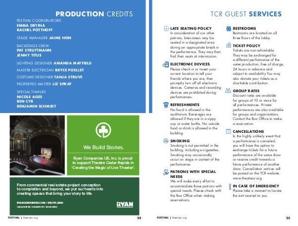 CANCELLATIONS In the highly unlikely event that a performance is canceled, you will have the option to exchange tickets for a future performance of the same show or receive credit towards a future performance of another show. Cancellation notices will be posted on the TCR website: www. theatrecr. org