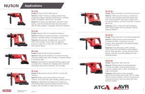 Features : Long run time with Nuron batteries , wider drilling range , ATC for protection , AVR for reduced vibration .