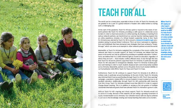 Meanwhile , as Teach For Armenia navigated the complexity of the recent conflict , the network was there to provide support . At Teach For Armenia , we believe that true peace in the world can only be achieved by providing an equitable education . Furthermore , we believe that it is a child ’ s inherent right to receive an education , regardless of where they are born — that includes conflict-affected areas . It was through this lens that Teach For All and its partners supported Teach For Armenia . In particular , through Teach For All ’ s Education in Emergencies initiative , Teach For Armenia received guidance and training in order to reach students displaced who were temporarily resettled across Armenia . Meanwhile , partners across the globe shone much needed visibility on our humanitarian relief efforts Teach For Peace and Teach For Hope .