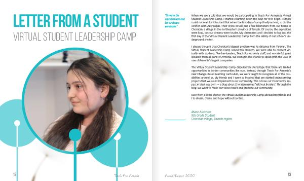 The Virtual Student Leadership Camp dispelled the stereotype that there are limited opportunities in border communities like ours . Instead , through Teach For Armenia ’ s new Change-Based Learning curriculum , we were taught to recognize all of the possibilities around us . My friends and I were so inspired that we started brainstorming projects that we could implement in our community . This is how our Community Impact Project was born — a blog about Choratan named “ Without Borders .” Through the blog , we want to make our voices heard and promote our community .