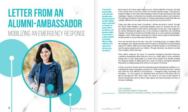 My journey in the Tavush region began in 2016 . I left the daily life of Yerevan , and with it my comfort zone , to become a Teach For Armenia Teacher-Leader . I was placed in Vazashen village on the border with Azerbaijan , where through teaching and new daily challenges , I began to understand my strengths and develop patience and endurance . The experience instilled in me the desire to continue developing my leadership skills and making a difference in the region that has now become my second home .