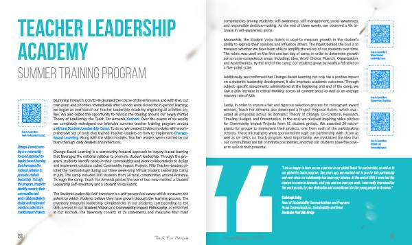 Change-Based Learning is a community-focused approach to inquiry-based learning that leverages the national syllabus to promote student leadership . Through the program , students identify needs in their communities and work collaboratively to design and implement solutions called Community Impact Projects . Fifty Teacher-Leaders piloted the methodology during our three week-long Virtual Student Leadership Camp in July . The camp included 300 students from 24 rural communities around Armenia . Through the camp , Teach For Armenia piloted the use of two new metrics : a Student Leadership Self-Inventory and a Student Voice Rubric .