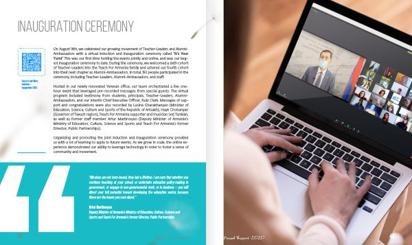 On August 18th , we celebrated our growing movement of Teacher-Leaders and Alumni- Ambassadors with a virtual induction and inauguration ceremony called “ It ’ s Your Turn !” This was our first time holding the events jointly and online , and was our largest inauguration ceremony to date . During the ceremony , we welcomed a sixth cohort of Teacher-Leaders into the Teach For Armenia family and ushered our fourth cohort into their next chapter as Alumni-Ambassadors . In total , 150 people participated in the ceremony , including Teacher-Leaders , Alumni-Ambassadors , and staff .