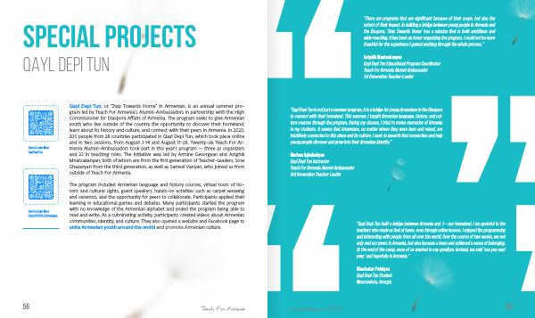 “ Qayl Depi Tun is not just a summer program , it is a bridge for young Armenians in the Diaspora to connect with their homeland . This summer , I taught Armenian language , history , and culture courses through the program . During my classes , I tried to revive memories of Armenia in my students . It seems that Armenians , no matter where they were born and raised , are intuitively connected to this place and its culture . I seek to unearth that connection and help young people discover and grow into their Armenian identity .”