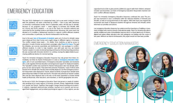 Our Emergency Education Response has underscored the importance of building a movement of leaders who work in pursuit of educational equity . Teach For Armenia was able to quickly mobilize and scale a humanitarian response due to a robust talent pool of missionaligned and values-driven educators who had undergone our training over the course of two years . Without our Alumni-Ambassadors , this project would not have been possible .