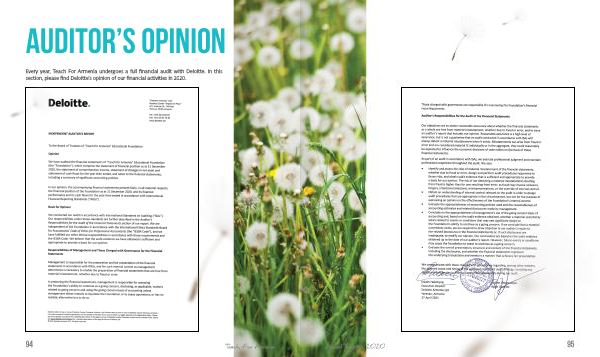 Every year , Teach For Armenia undergoes a full financial audit with Deloitte . In this section , please find Deloitte ’ s opinion of our financial activities in 2020 .