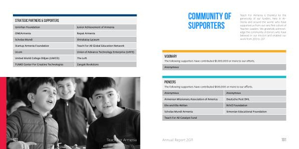 Teach For Armenia is thankful for the generosity of our funders , here in Armenia and around the world , who have supported us from our very first cohort of Teacher-Leaders . We gratefully acknowledge the community of donors who have believed in our mission and enabled our work from 2013 to 2021 .