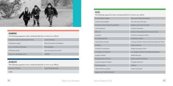 Carlos Potikian JHM Charitable Foundation Nina Quigley Rafi Manoukian Sam and Sylva Simonian * Teach For All Bridge Fund