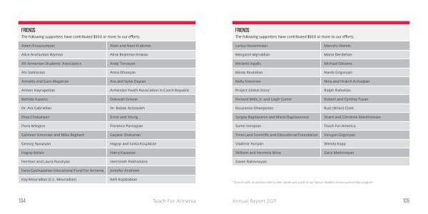 Marcelo Wende Maria Derderian Michael Olivares Narek Grigoryan Nina and Hratch Achadjian Ralph Rafaelian Robert and Cynthia Tusan Ruiz ( Brian ) Clark Shant and Christine Mardirossian Teach For America Varujan Grigoryan Wendy Kopp Zarui Martirosyan