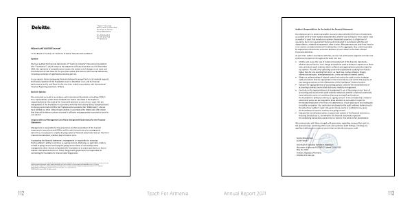 We have audited the financial statements of “ Teach for Armenia ” Educational Foundation ( the “ Foundation ”), which comprise the statement of financial position as at 31 December 2021 , the statement of comprehensive income , the statement of changes in net asset and the statement of cash flows for the year then ended , and notes to the financial statements , including a summary of significant accounting policies .