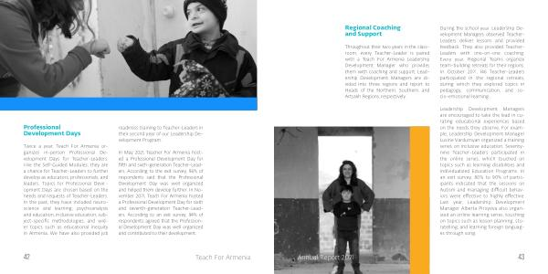 In May 2021 , Teacher For Armenia hosted a Professional Development Day for fifth and sixth-generation Teacher-Leaders . According to the exit survey , 96 % of respondents said that the Professional Development Day was well organized and helped them develop further . In November 2021 , Teach For Armenia hosted a Professional Development Day for sixth and seventh-generation Teacher-Leaders . According to an exit survey , 94 % of respondents agreed that the Professional Development Day was well organized and contributed to their development .